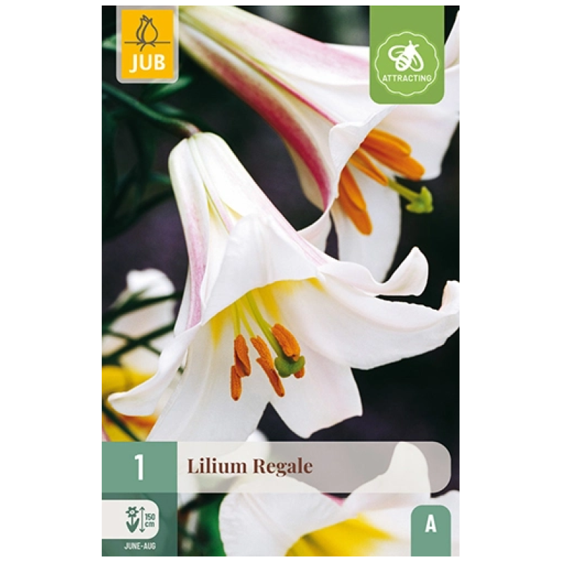Klassisk kongelilje med store, hvite trompetformede blomster og gyllen hals. Sterk, søt duft. Ca. 120–150 cm høy og blomstrer i juli–august. Trives i sol og veldrenert jord. En majestetisk og tidløs lilje.