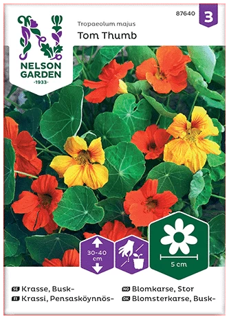 Fargesterk og kjær sommerblomst i gult, oransje og rødt. Sorten gir kompakte planter, fin som kantplante, i balkongkasser, bed og steinpartier. 30-40 cm lang. Blomstene kan spises, dekorative i salater. Umodne frø kan legges inn som kapers. Trives fint i mager og veldrenert jord. I altfor næringsrik jord utvikles bladene på blomstenes bekostning. Vann regelmessig og gi lite næring. Legg frøene i lunkent vann 1døgn, så spirer de bedre.