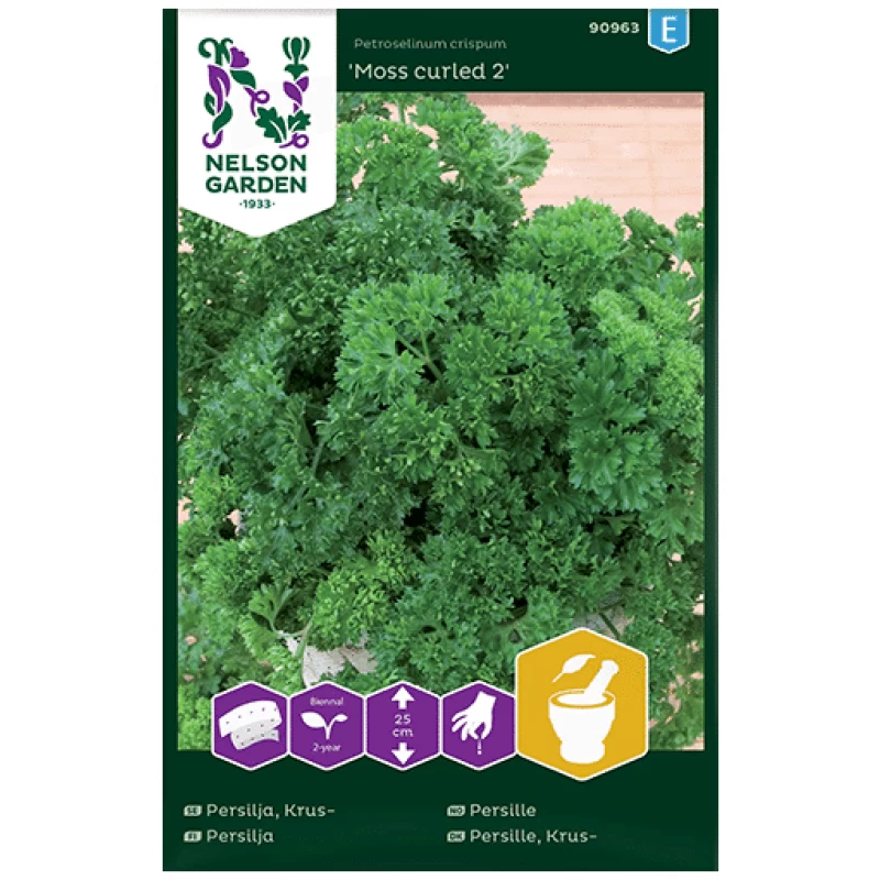 Latinsk navn: Petroselinum crispum Planteavstand, cm: 5 Radavstand, cm: 40 Høyde, cm: 25 Levetid: 2-årig Beliggenhet: Sol Prisgruppe: E Antall frø: 300 Holder til: 6 M