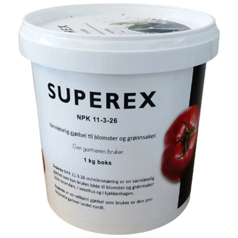 Superex er kvalitetsgjødsel. En blanding som brukes i profesjonelle gartnerier. Dette er en vannløselig gjødsel som brukes i vekstsesongen til alle blomstrende og grønne planter, samt grønnsaker. Superex er kjent for å gi frodige planter med god blomstring. Kan brukes i kombinasjon med Kalksalpeter.